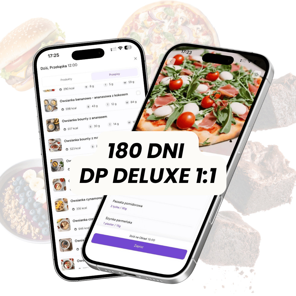 180 dni pełnej współpracy DP razem z  dostępem do aplikacji DP: ponad 8 000 przepisów, lista zakupów, chat i raporty postępów.