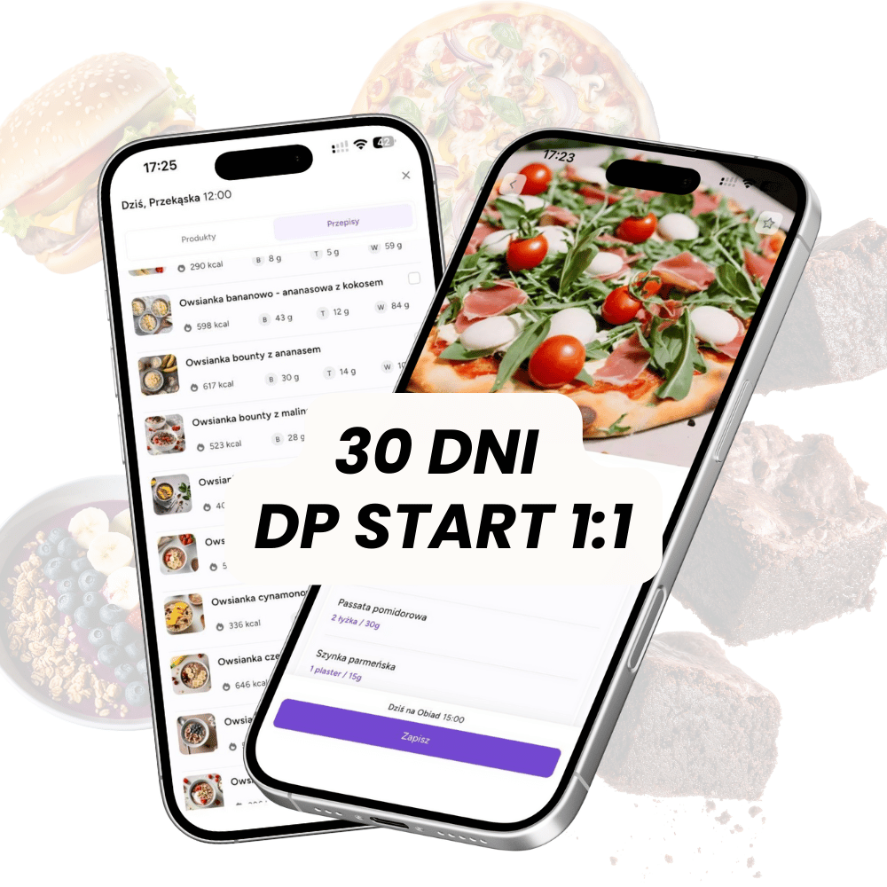 30 dni pełnej współpracy DP razem z  dostępem do aplikacji DP: ponad 8 000 przepisów, lista zakupów, chat i raporty postępów.
